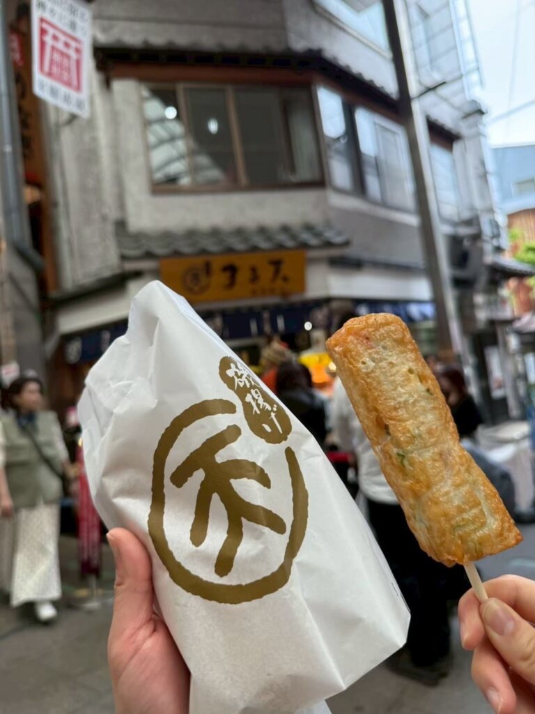 まずは磯揚げまる天、食べ歩きのマストスポット。店頭で揚げたての磯揚げが売られていて、磯の香りが食欲をそそります。